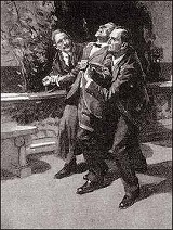 “My dear sir, if you did anything so foolish you would probably enlarge the too limited titles of our village inns by giving us ‘The Dangling Prussian’ as a signpost. The Englishman is a patient creature, but at present his temper is a little inflamed, and it would be as well not to try him too far. No, Mr. Von Bork, you will go with us in a quiet, sensible fashion to Scotland Yard, whence you can send for your friend, Baron Von Herling, and see if even now you may not fill that place which he has reserved for you in the ambassadorial suite. As to you, Watson, you are joining us with your old service, as I understand, so London won’t be out of your way. Stand with me here upon the terrace, for it may be the last quiet talk that we shall ever have.”