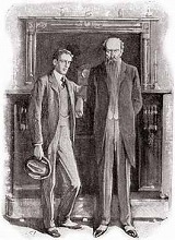I was, of course, familiar with the pictures of the famous statesman, but the man himself was very different from his representation. He was a tall and stately person, scrupulously dressed, with a drawn, thin face, and a nose which was grotesquely curved and long. His complexion was of a dead pallor, which was more startling by contrast with a long, dwindling beard of vivid red, which flowed down over his white waistcoat, with his watch-chain gleaming through its fringe. Such was the stately presence who looked stonily at us from the centre of Dr. Huxtable’s hearthrug. Beside him stood a very young man, whom I understood to be Wilder, the private secretary. He was small, nervous, alert, with intelligent light-blue eyes and mobile features. It was he who at once, in an incisive and positive tone, opened the conversation.